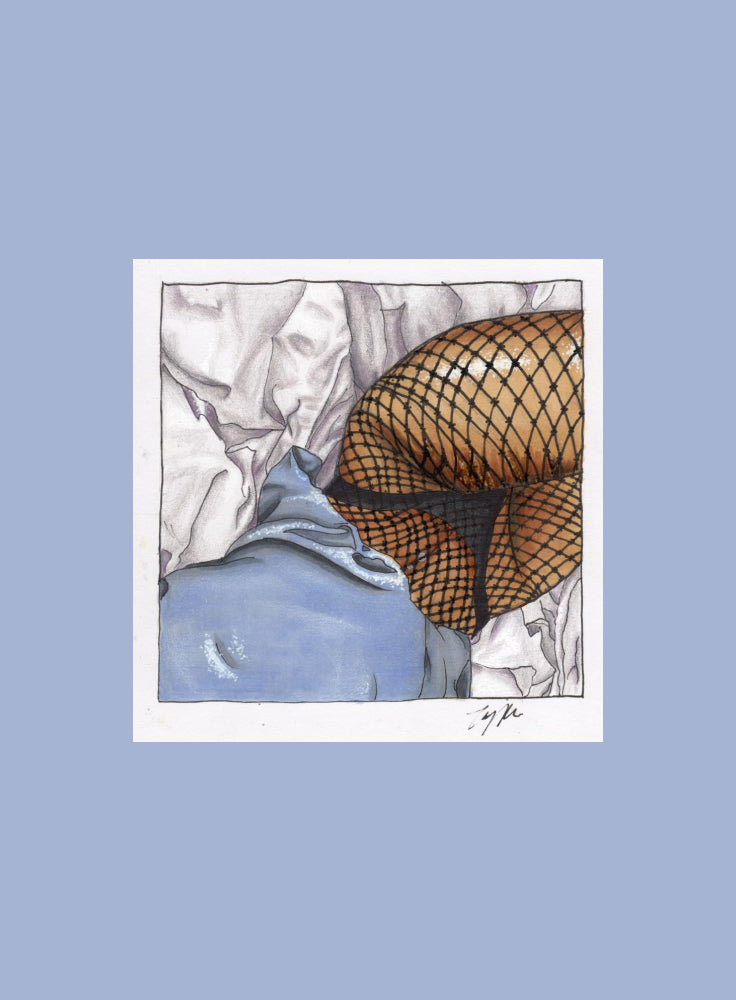 An original Tay Filrup, a women in fishnets and in her love's T-shirt. This was illustrated using liners, Copic markers and gel pen. The canvas is an odd sizing so it will be printed on A4 and A3 paper and cut to size. Archival print includes a care guide with tips on how to care for fine art along with name, exact size and edition.