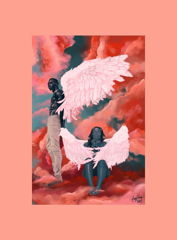 A monochromatic, gouche style painting of angelic figures. This was digitally illustrated Procreate on an iPad Pro, using an array of brushes and techniques with a teal-green toned palette. The canvas was originally drawn on A4 but prints beautifully as A3 also. Archival print includes a care guide with tips on how to care for fine art along with name, exact size and edition.